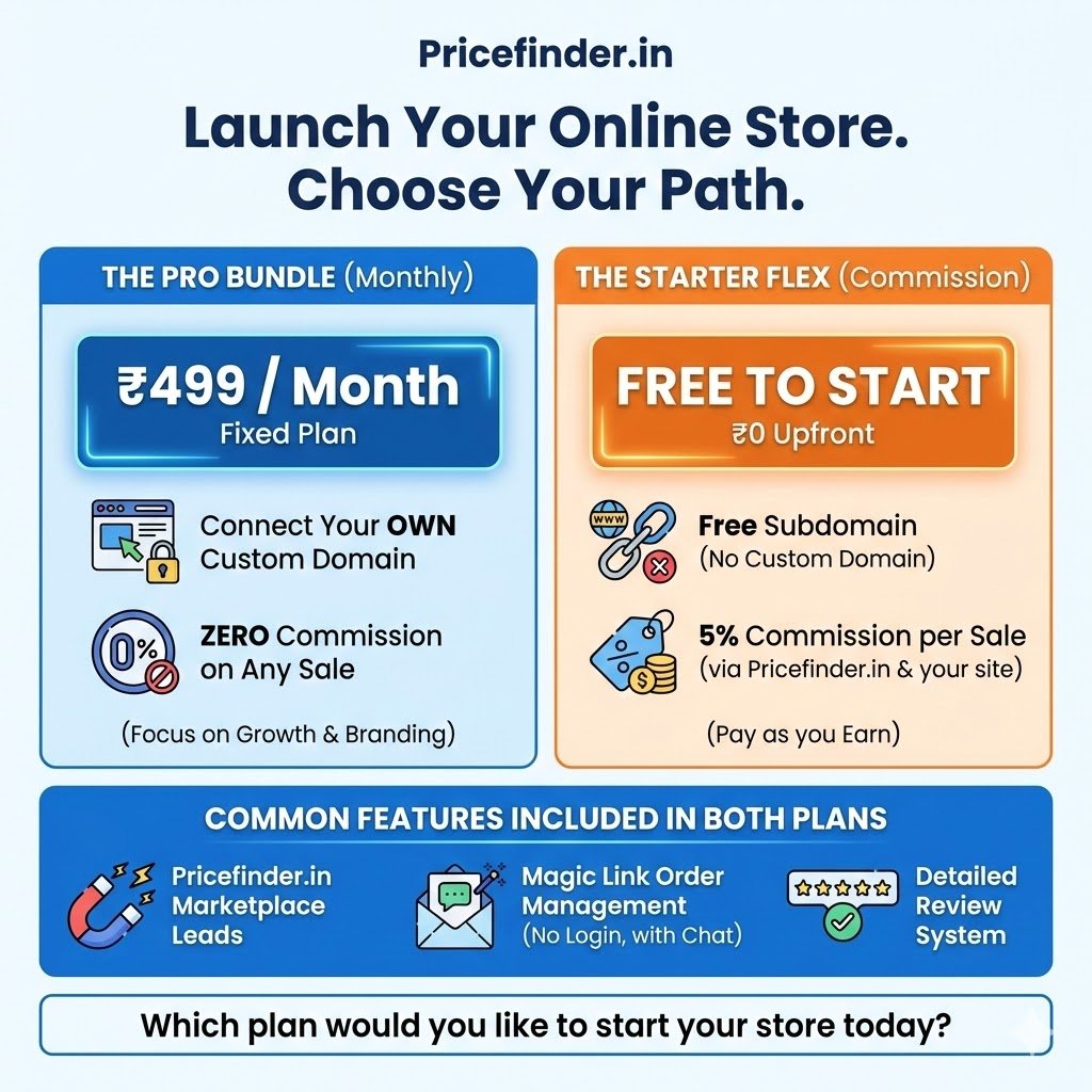 🔹 PLAN A: The Brand Builder (₹499/mo) ✅ Connect your OWN Custom Domain (Build your brand identity!) ✅ 0% Commission on your sales. Keep 100% of your profit. ✅ Best for established sellers ready to scale.